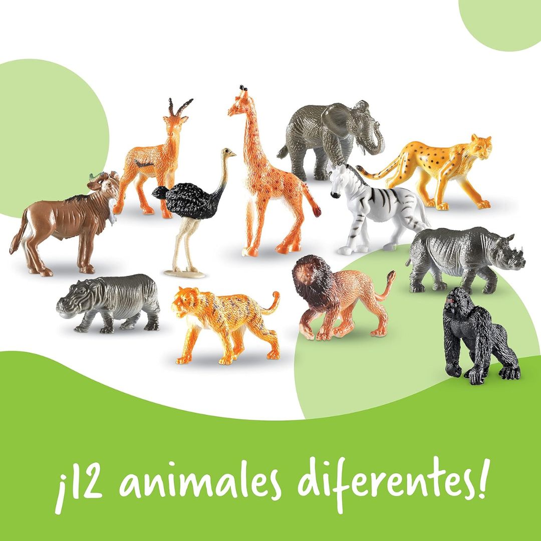 • Inlcuye 60 piezas, 12 animales diferentes (guepardo, elefante, gacela, jirafa, ñu, gorila, hipopótamo, león, avestruz, rinoceronte, tigre, cebra)