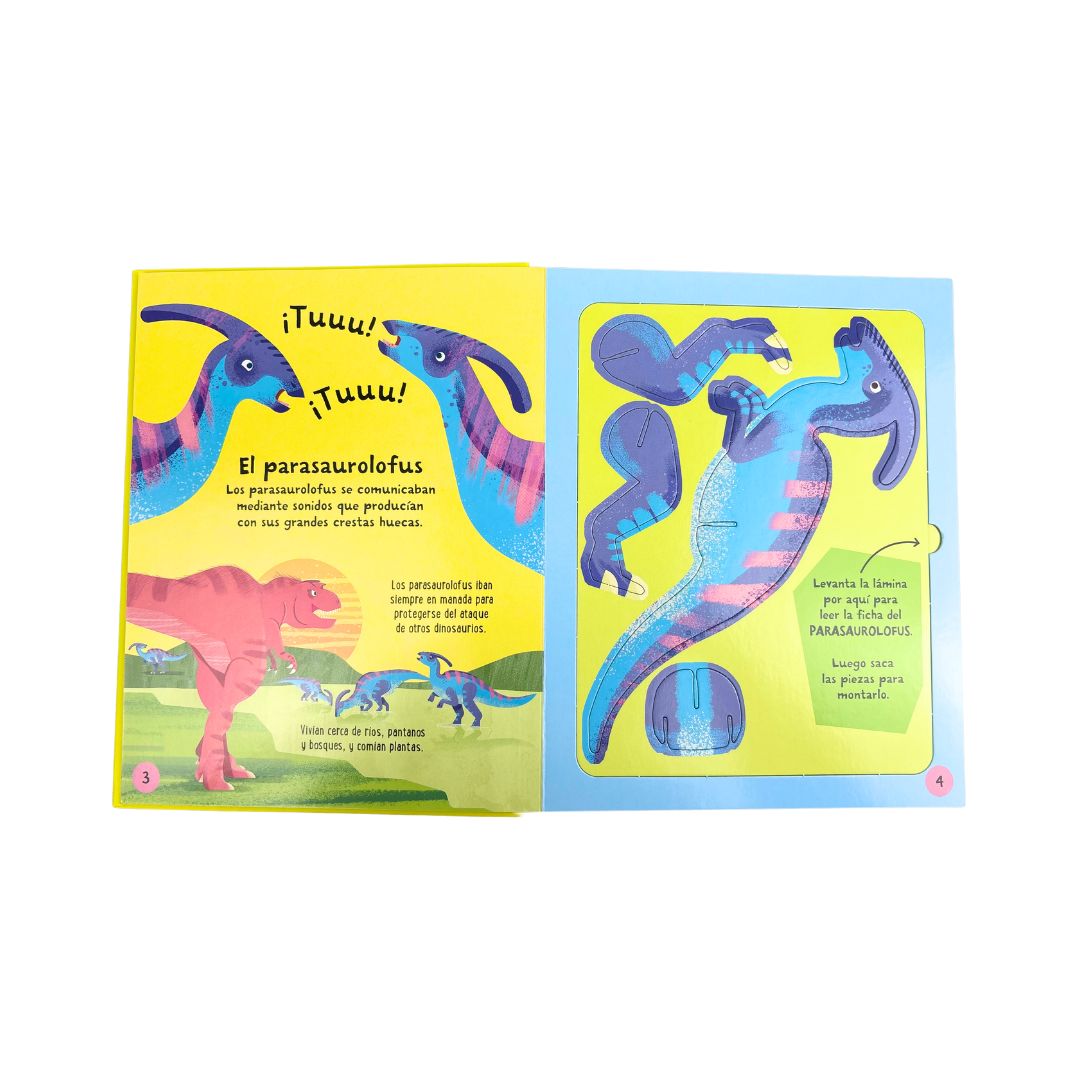 Este no es un libro cualquiera. En las dobles páginas de su interior los lectores encontrarán piezas precortadas que podrán encajar, siguiendo las sencillas instrucciones, para crear cinco robustas figuras de dinosaurios. Además, junto con las piezas se incluye una ficha que contiene información sobre cada animal. Incluye los dinosaurios siguientes: T. rex, estegosaurio, triceratops, braquiosaurio y parasaurolofus.
