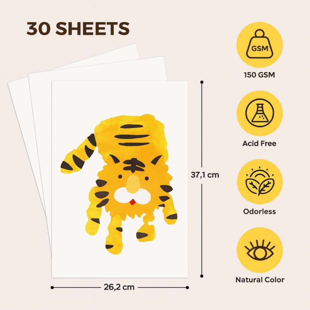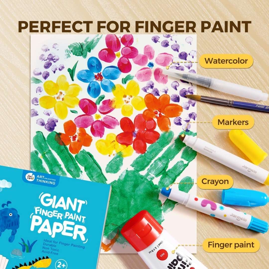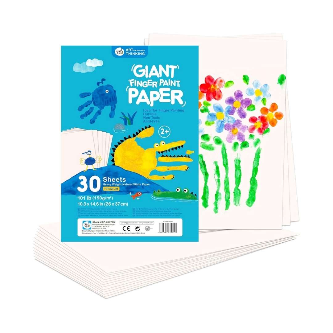 El kit de papel de pintura grande viene con 30 hojas y mide 10.3 x 14.6 pulgadas, hay un montón de espacio para la imaginación y creatividad de tu pequeño con el dedo.