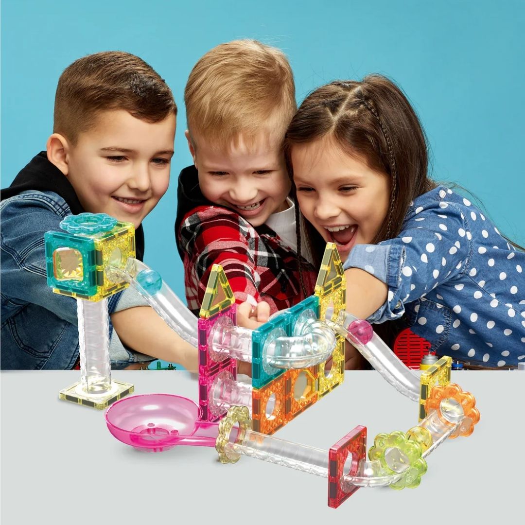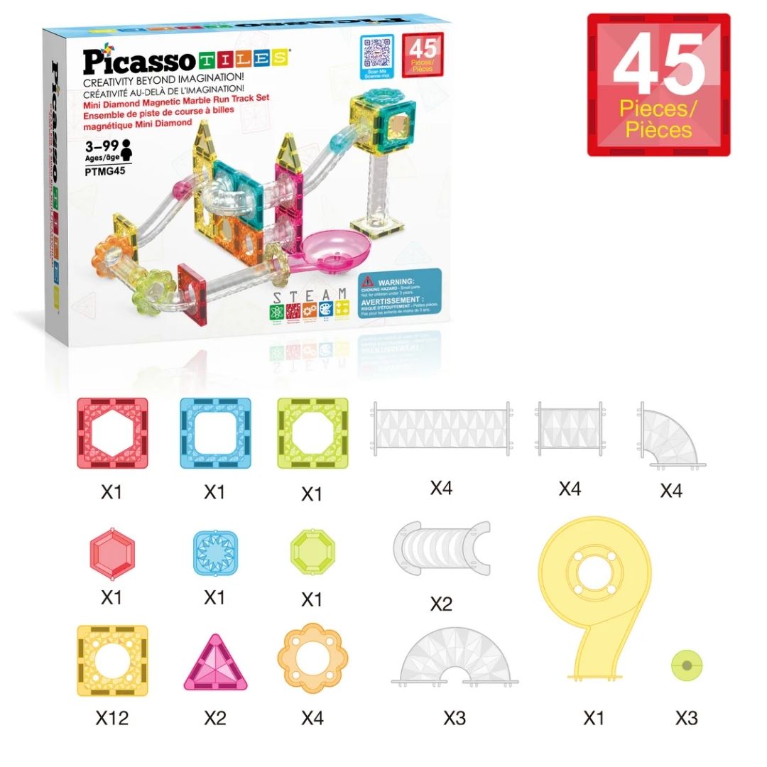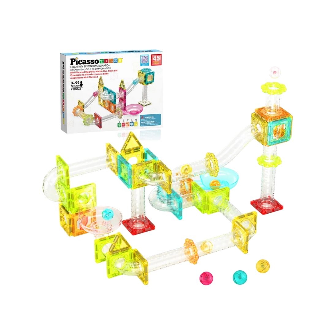 Explora tu creatividad dondequiera que estés con el set de construcción PicassoTiles de tamaño viaje: pista de canicas y fusión de piezas magnéticas.