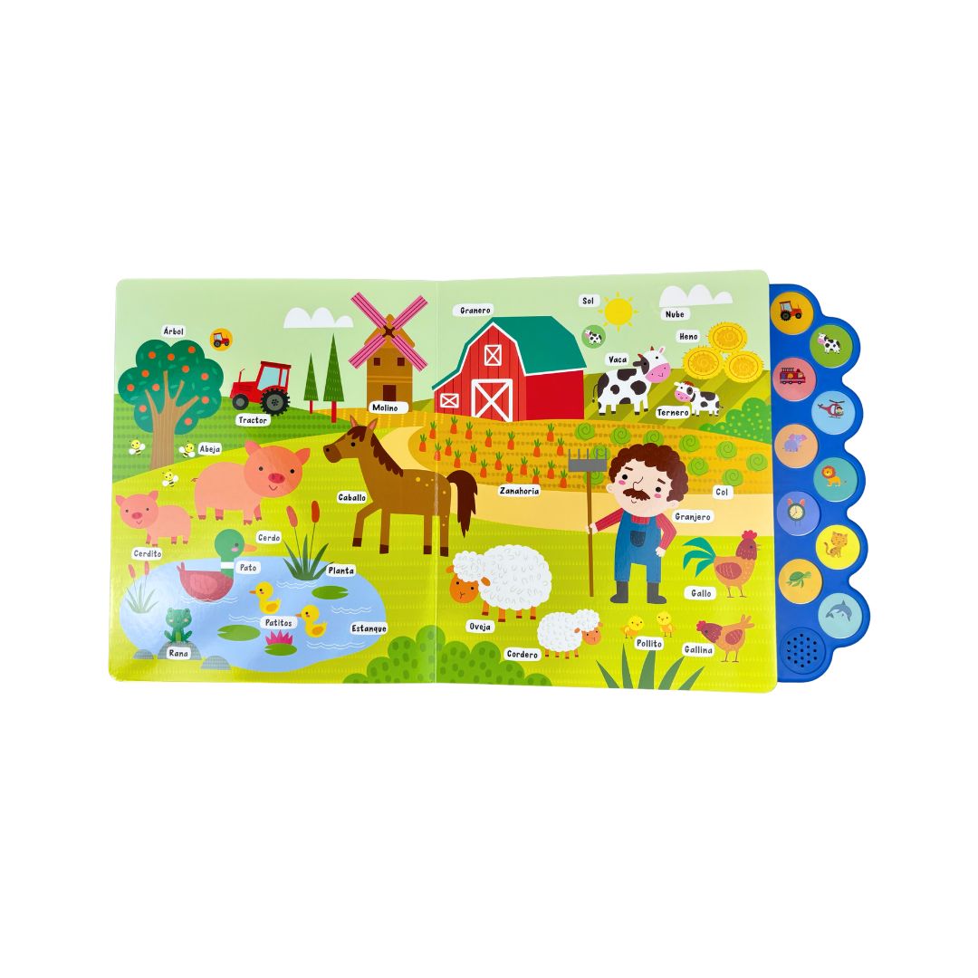 ¡Aprende tus primeras palabras con este encantador libro ilustrado! Lee las palabras en cada escenario y presiona los botones para escuchar los sonidos.
