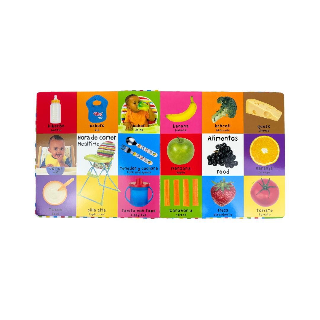 Para el aprendizaje de los lectores más pequeños, y es una herramienta ideal para ensenar nuevas palabras en dos idiomas: inglés y español. Entre las páginas, hay más de 100 fotografÃas sobresalientes de alimentos, animales, juguetes, y más que los niños reconocerán en sus propias vidas. Cada imagen va acompañada por su descripción en inglés y español, escrita con letras grandes y marcadas. Este libro es una gran ayuda para implementar un vocabulario bilingüe y ensenar palabras visuales en ambos idiomas.