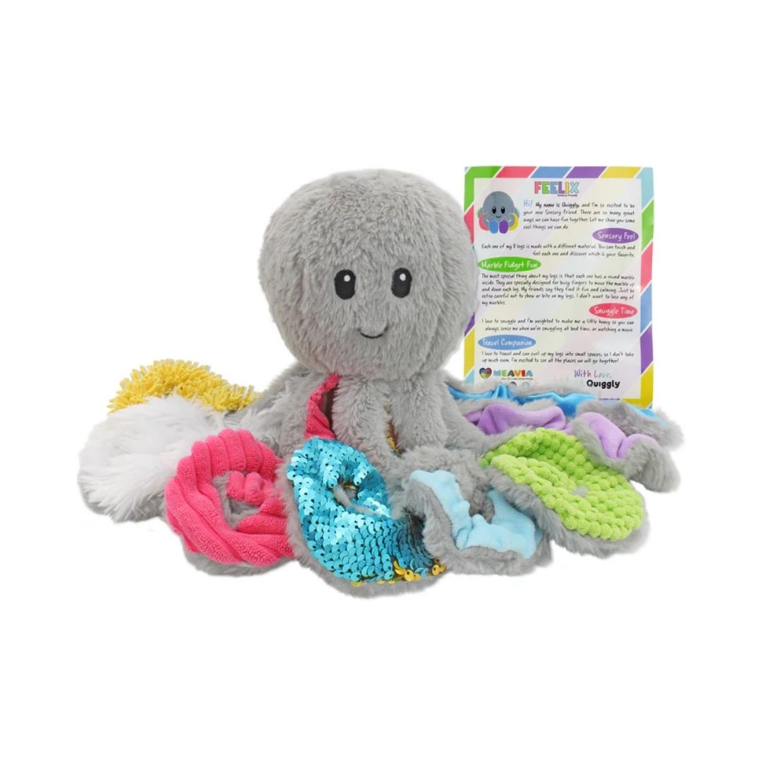 el Pulpo Sensorial, está diseñado para brindarles a los niños una experiencia sensorial única. Este peluche de alta calidad está diseñado con diversos materiales sensoriales que estimularán las necesidades sensoriales de tu hijo. Cada tentáculo está especialmente diseñado con una tela sensorial diferente y también tiene una canica en cada pata para los niños que adoran jugar.