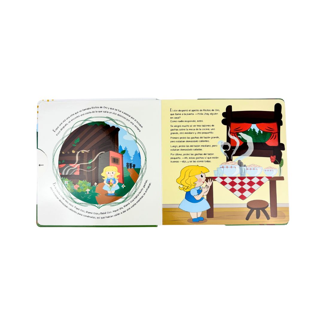 Este es un libro infantil del clásico cuento de “Ricitos de Oro y los Tres Osos”. La versión que se muestra en la imagen incluye una casa desplegable y es parte de un formato interactivo diseñado para captar la atención de los más pequeños mientras escuchan o leen la historia.