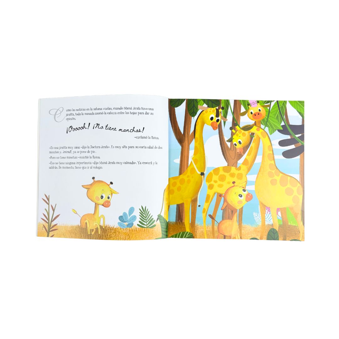 La pequeña jirafa ha nacido sin manchas y le preocupa mucho que los otros animalitos se rían de ella en la escuela. Sin embargo, en su clase también hay una cebra sin rayas, una serpiente corta, un león sin melena, un búfalo muy bajito o una suricata miope, ¡y no pasa nada porque pueden jugar todos juntos!