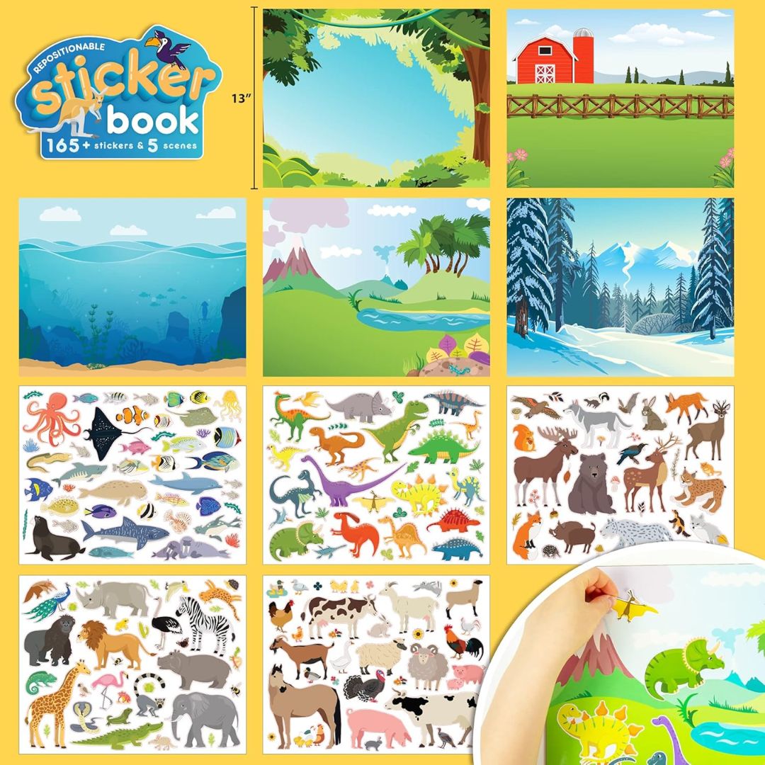 • Pegatinas removibles y escenas de juego de animales reutilizables.