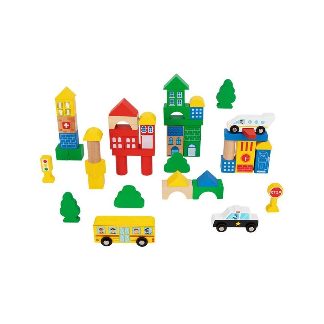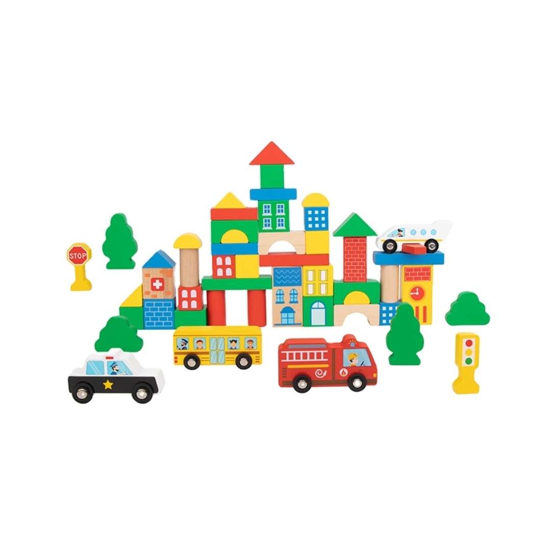 Este set de bloques de madera incluye edificios, vehículos y señales de tránsito para que los niños creen, armen y jueguen mientras desarrollan su creatividad y coordinación.