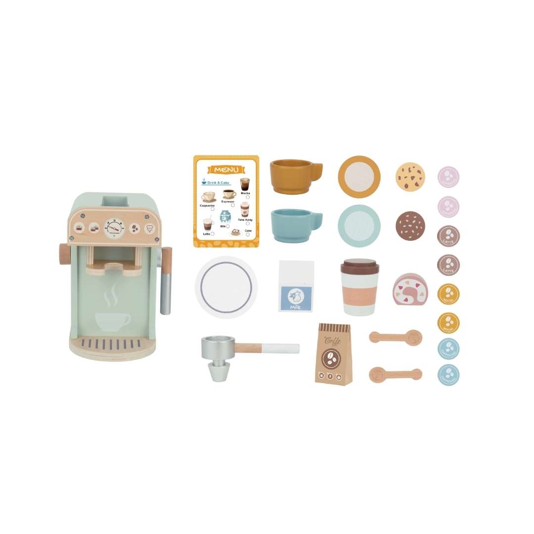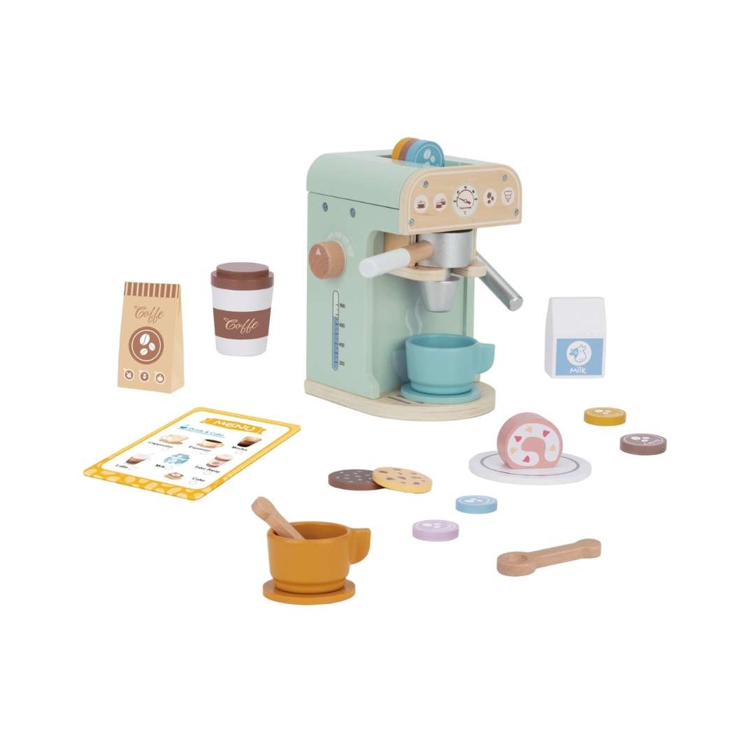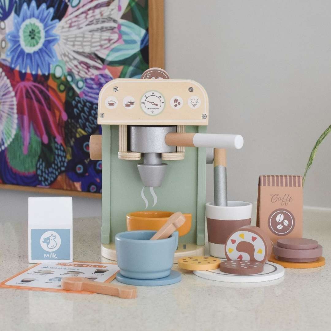 Disfruta del arte de hacer café con el juego de cafetera barista de madera, donde los pequeños pueden crear aventuras imaginativas y servir deliciosas bebidas para jugar.