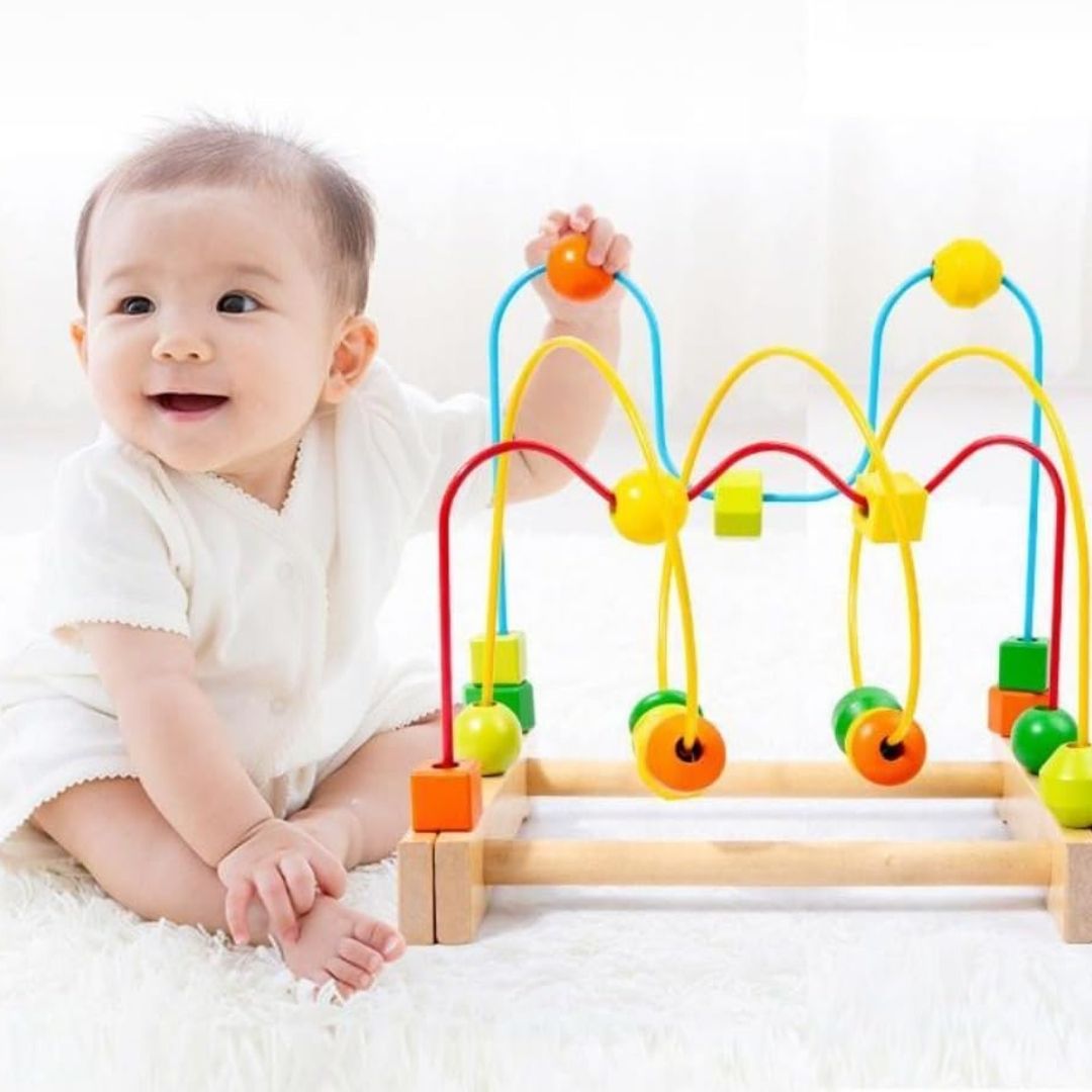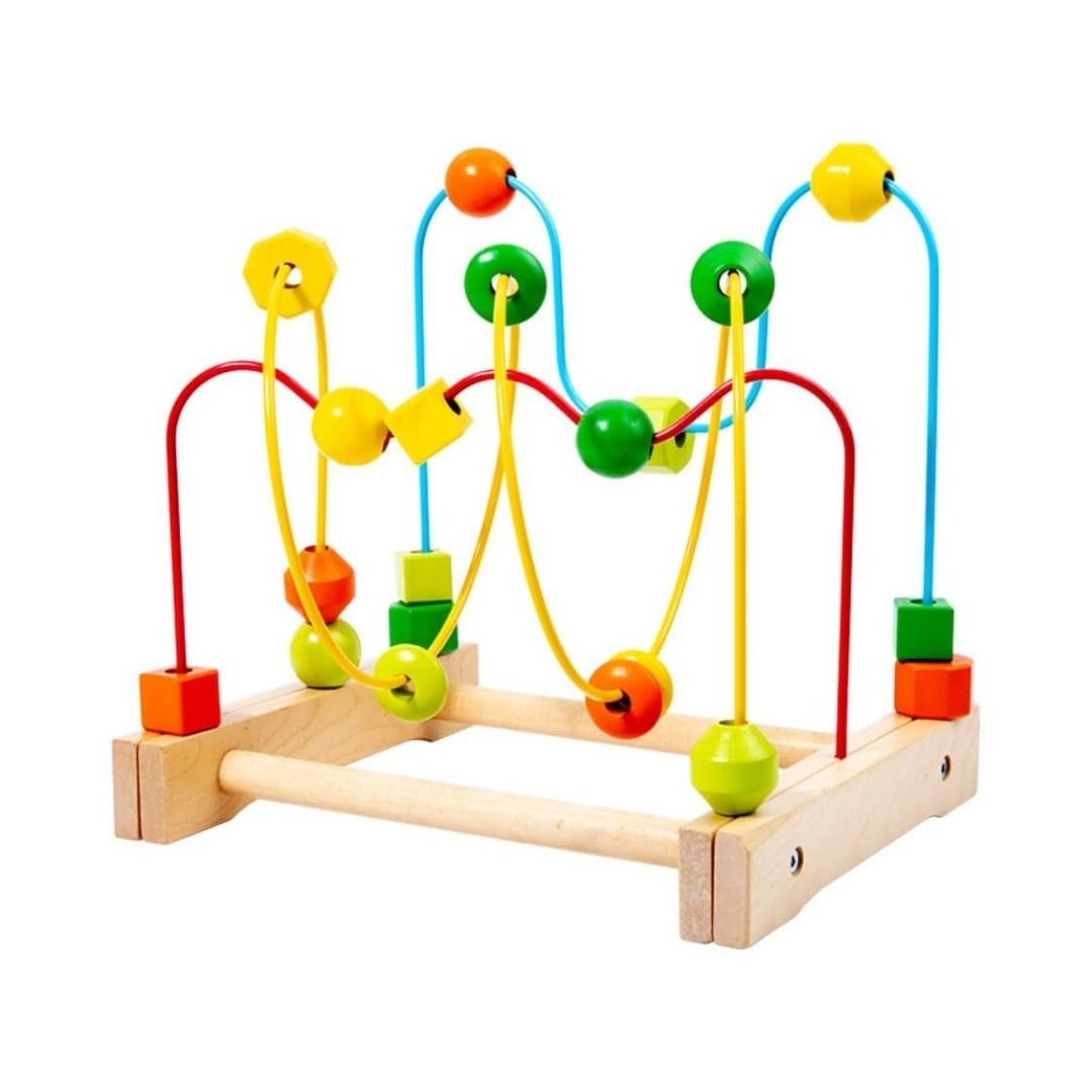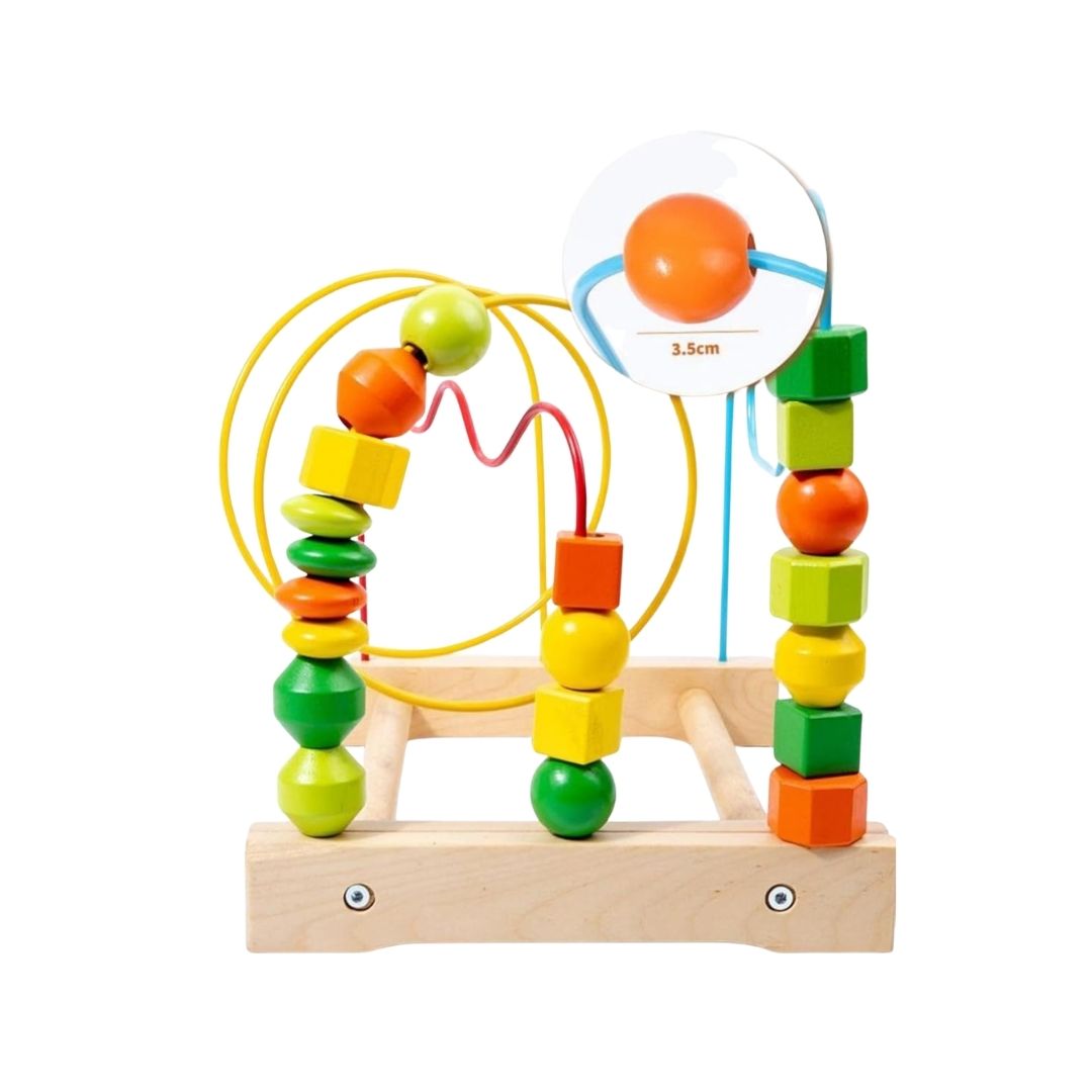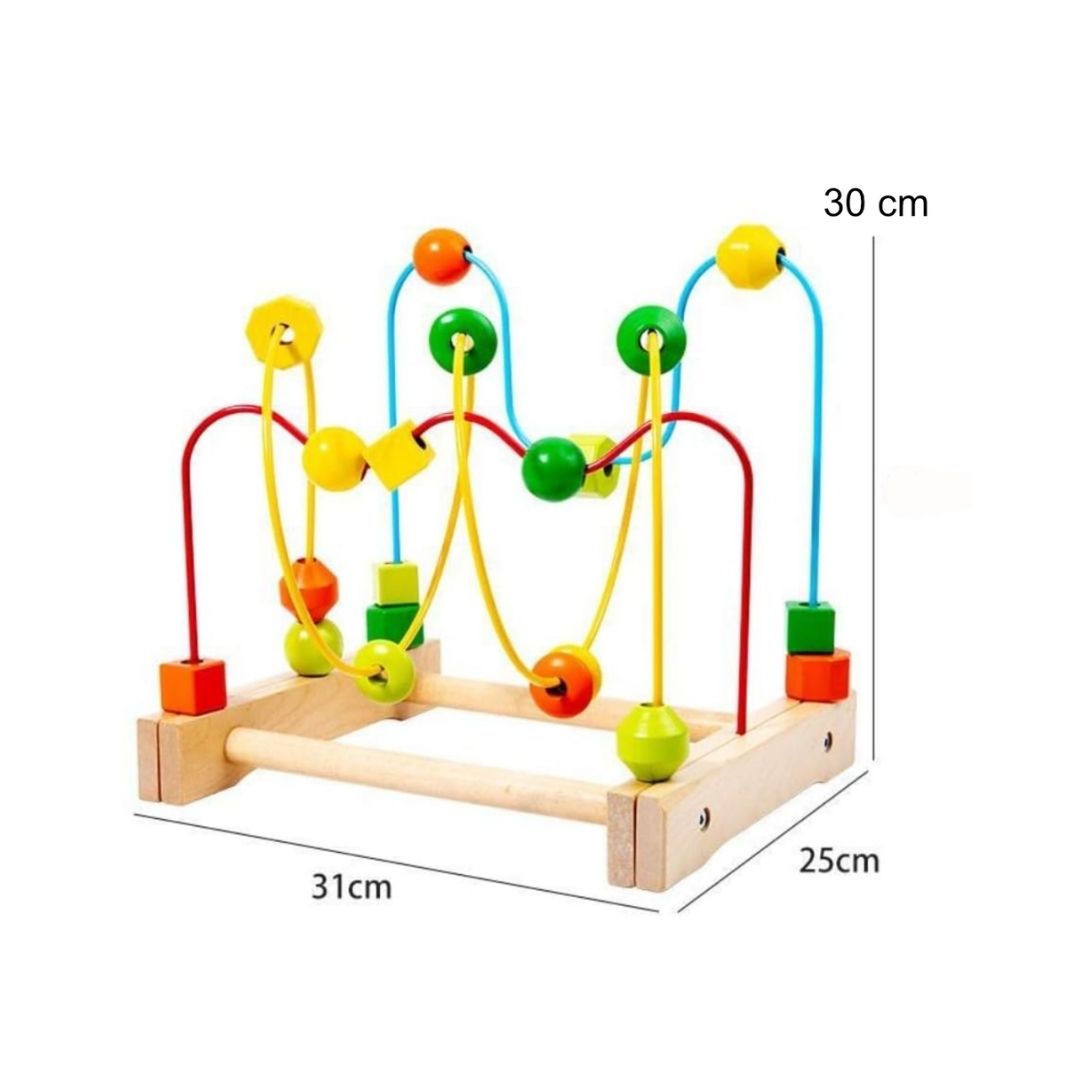 Es un clásico indispensable en cualquier espacio de juego educativo. Con una altura destacada de 30 cm, este juguete ofrece una estructura de alambres entrelazados por donde se deslizan cuentas y bloques de madera en colores vibrantes. Además, su base de madera natural garantiza estabilidad y una estética cálida que invita a la manipulación constante.