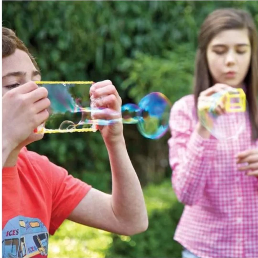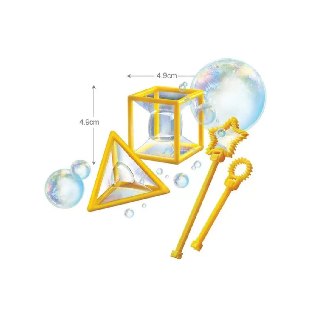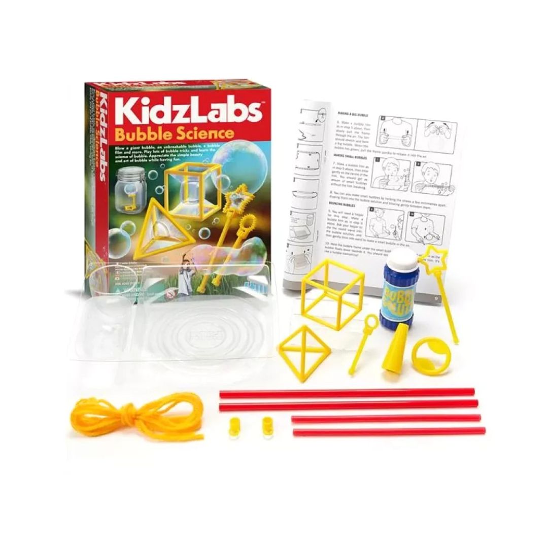 Sopla una burbuja gigante, una burbuja irrompible, una pelÃcula de burbujas y más. Aprecia la sencilla belleza de la geometrÃa de las burbujas, el arte con burbujas y la escultura de burbujas. Haz un montón de trucos con burbujas y aprende la ciencia de las burbujas mientras te diviertes. El kit que garantiza horas de diversión. Incluye recetas para preparar tu propia solución de burbujas casera de alta calidad.