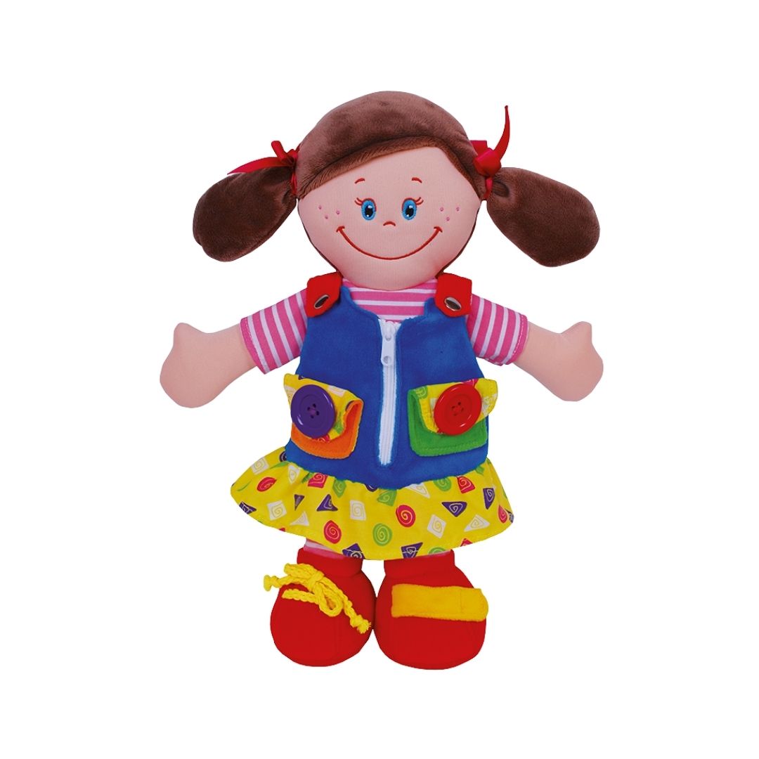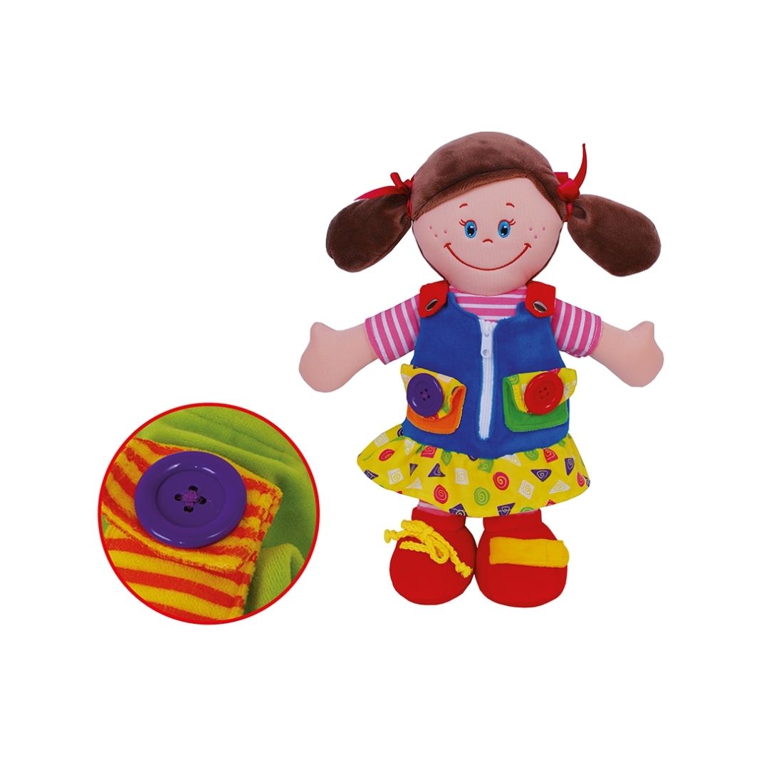 Esta tierna muñeca de tela no es solo un juguete, es una guía de descubrimientos. Diseñada en vivos colores, invita a los niños a explorar y dominar pequeños desafíos cotidianos que fortalecen su confianza y motricidad.