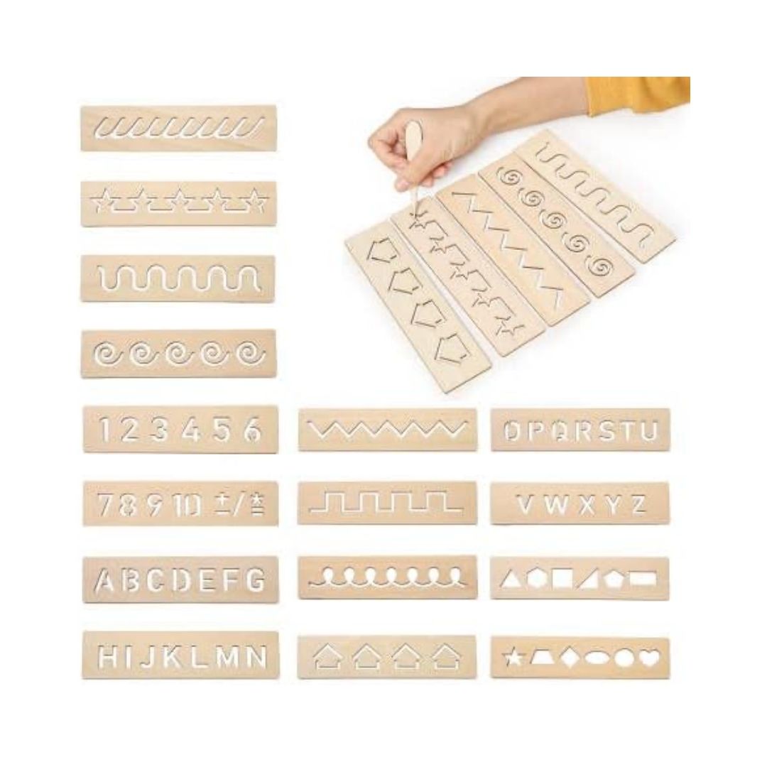 • Kit Completo de Aprendizaje: Incluye 16 tableros de trazado y 2 plumas de madera, permitiendo realizar diversas actividades de reconocimiento de patrones y letras.