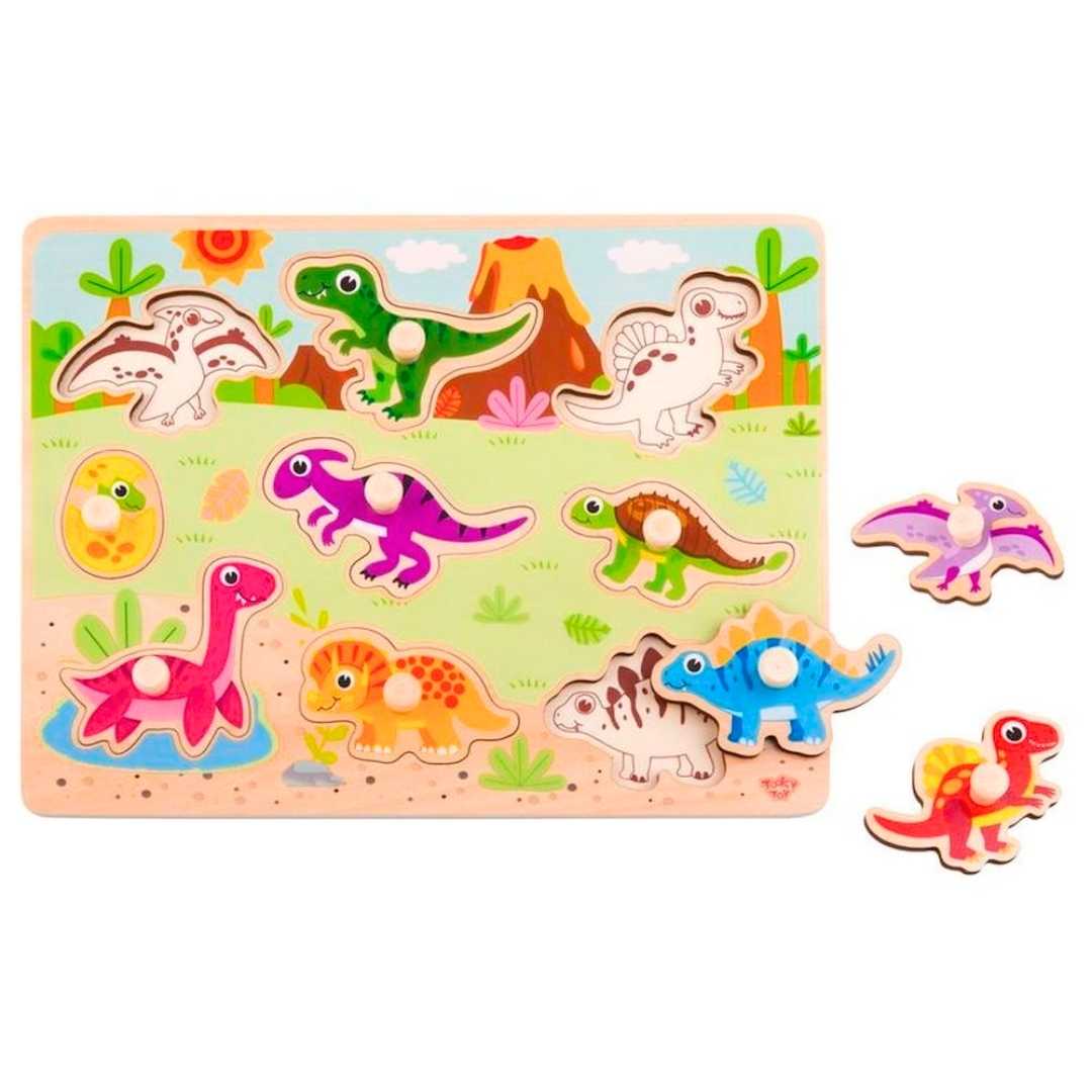 Este rompecabezas ayuda a los niños a desarrollar el reconocimiento de formas y la motricidad fina mientras se divierten con las coloridas ilustraciones de dinosaurios.