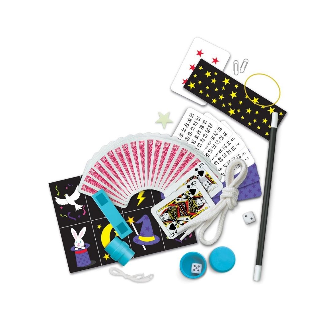 - Incluye todo lo necesario para realizar 12 emocionantes trucos, como una varita mágica, cartas, una cuerda, cartas de números mágicos y accesorios especiales